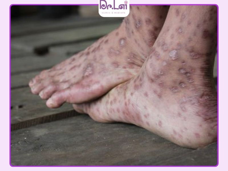 - Xuất hiện mụn nước nhỏ li ti ở lòng bàn chân hoặc mu bàn chân: Khi mụn vỡ, vùng da dễ chảy dịch, đóng vảy và lan rộng nếu không chăm sóc đúng cách.
